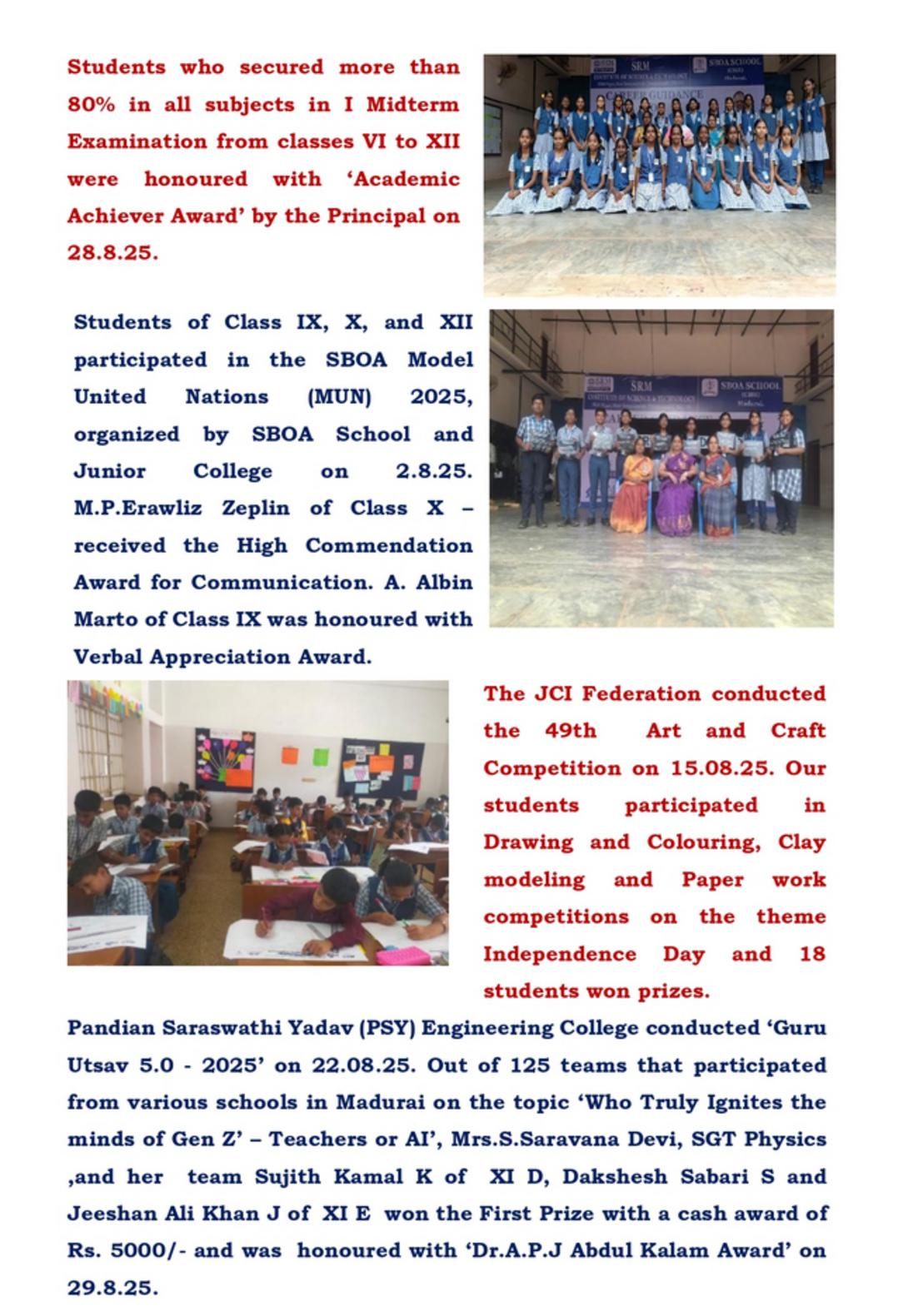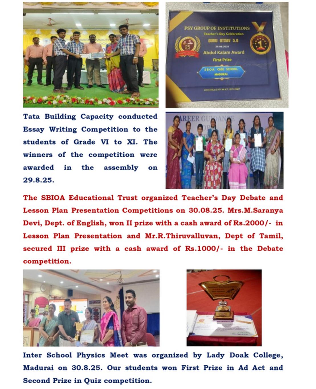 - 10.7.25 -மதுரை சி.இ. ஓ.ஏ. பதின்ம மேனிலைப் பள்ளியில் மாவட்ட அளவிலான என்.எம்.எஸ். கல்வித்திருவிழா பேச்சுப்போட்டி நடைபெற்றது. இதில் ஹெ. கரோலின் கெட்சி -XI A மாவட்ட அளவில் முதல் பரிசாக ரூபாய் 7000 , பதக்கம் மற்றும் பாராட்டுச் சான்றிதழைப் பெற்றார் .செல்வி செ. ஜெ. கீதனா -IXG மாவட்ட அளவில் மூன்றாம் பரிசாக ரூபாய் 3000, பதக்கம் மற்றும் பாராட்டுச் சான்றிதழைப் பெற்றார். மாவட்ட அளவில் முதலிடம் பெற்ற ஹெ. கரோலின் கெட்சி மாநில அளவிலான போட்டியில் பங்கேற்கத் தகுதி பெற்றார்.