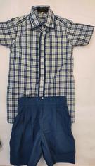 Boys Peacock blue shorts, Checked Blue Half Sleeves Shirt, Black Shoes with white lined Grey socks, School Belt
