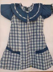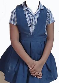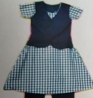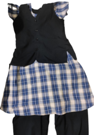 Girls Navy blue Salwar, Checked blue Kameeze with (no slit on either side) Navy blue Waist Coat, Black Ribbon, Black Canvas Shoes.