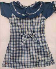 Girls Peacock Blue Pinafore, Checked Blue Half Sleeves Shirt, Black Shoes with White lined Grey socks, Black Ribbon.